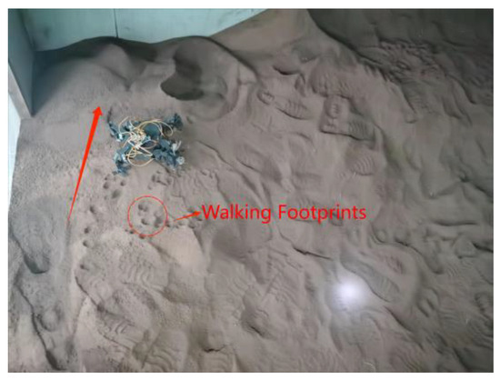 Figure 19 is a top view of the walking process of the prototype in a three-legged gait, with a white knot as the target. The legs are divided into two groups: 1, 3, 5, and 2, 4, and 6. The red numbers represent the legs when in the supporting phase, the yellow numbers represent the swinging phase, and the red arrows represent the direction of motion. From Figure 19, it can be seen that when Legs 1, 3, and 5 are lifted, the landing points of Legs 2, 4, and 6 are triangular in shape to provide stable support, and the movements of the two groups of legs are periodic. Figure 20 is a side view of the robot walking. It can be seen that the circular foot ends of the prototype are basically covered by lunar soil during walking. At this time, the extension mechanism is extended and supported on the lunar soil to prevent further foot sinking. This reduces the resistance of the foot during the next lift, making the walking of the prototype more stable, and avoiding overturning and deviation from the target point. Figure 21 shows the walking trajectory of the prototype. According to actual measurements, the prototype walked a distance of approximately 230 mm within 12 s. In the 230 mm straight walk, the prototype shifted to the left by approximately 32 mm. Compared with the simulation results, due to the soft and bumpy lunar soil of the lunar module, insufficient accuracy of the servo and installation errors, the robot’s footprint is not in a vertical line but a diagonal line, and still within the error range.
