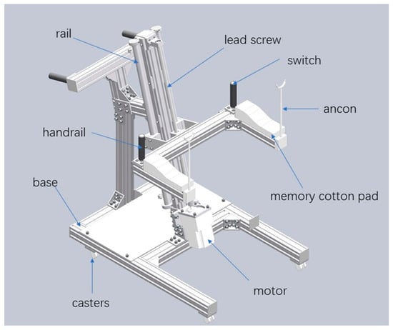 The dimensions of the STS movement assistive device are determined according to GBT 10000-1988 “Chinese Adult Human Body Dimensions (Standard State: Current)” [23] to meet the usage of 95% percentile body sizes. Main body dimensions include a height of 178 cm, a forearm length of 26 cm, a thigh length of 50 cm, and a calf length of 40 cm. The STS movement assistive device structure is shown in Figure 2.