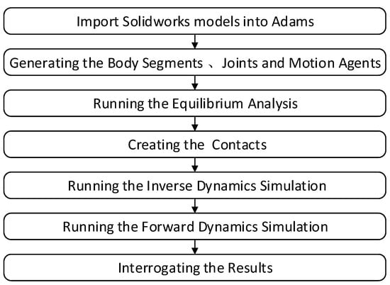 Inverse dynamic simulations are conducted using the imported motion data, recording the movement angles of each joint and automatically creating functions for forward dynamics. Adams motion model is shown in Figure 3. Subsequent forward dynamic simulations are performed to obtain the torque of each joint of the human body as well as the contact forces between the body and the environment. The entire process of Adams LifeMOD simulation is illustrated in Figure 4.