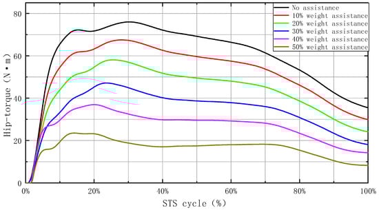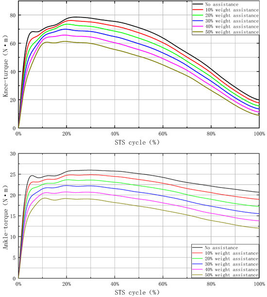 With the provided assistance, different levels of assistance were set at 0%, 10%, 20%, 30%, 40%, and 50% of body weight. Through simulation calculations, the torque values for the knee joint, the hip joint, and the ankle joint were obtained. In the graph, the horizontal axis represents the STS movement cycle, while the vertical axis represents the joint torque. Different colors were employed to distinguish results under various assistive levels. The biomechanical simulation results are shown in Figure 5.