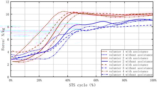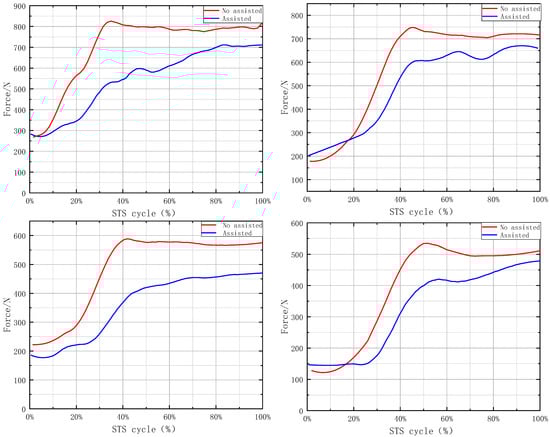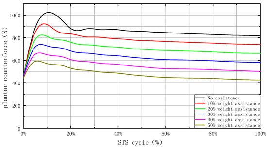 Figure 6 displays simulation results, where the horizontal axis represents the STS motion cycle and the vertical axis represents the contact force between the foot sole and the ground. Results for different assistance levels were distinguished using different colors.