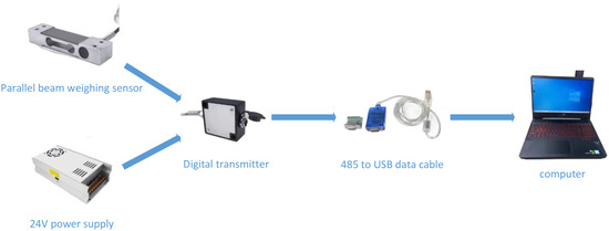 To capture the variations in vertical plantar pressure during the STS movement, a force-measuring platform was constructed. This platform included parallel beam weighing sensors, a digital signal transmitter, communication lines, and a computer. The parallel beam weighing sensor, as the core component of the system, measured force by utilizing the minor deformations that occurred within its elastomer under force. These deformations caused changes in the resistance value of strain gauges on the surface of the elastomer, which were then converted into voltage signals proportional to the applied force through a Wheatstone bridge circuit, achieving precise measurement. The key parameters of the sensor are shown in Table 2. This sensor offered several advantages, such as high output sensitivity, insensitivity to the location of the load point, and excellent consistency, all contributing to the accuracy and reliability of the measurements. The sensor’s parameters are detailed in Table 3. The digital signal converter was responsible for amplifying and converting an analog signal into a digital signal, which was then transmitted to the computer via a 485-communication line. To ensure the accuracy of measurements, the sensor was calibrated before the experiments. The sensor connection method is shown in Figure 7.
