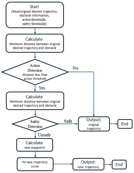 Inputs for the algorithm encompass the obstacle’s position and radius , current position for TTWR P, the initial trajectory T, along with predefined action and safety thresholds denoted by and , respectively. The algorithm delineated herein is bifurcated into two primary components.