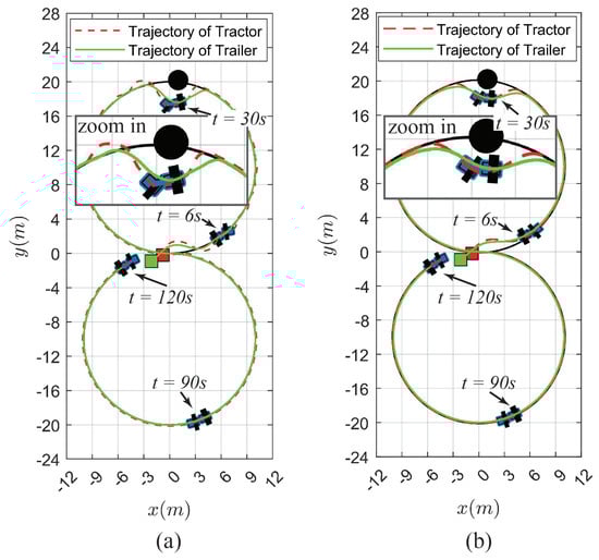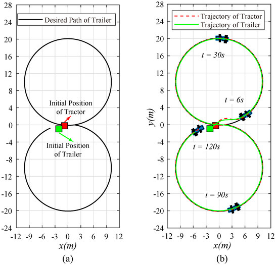 The control gain K was set at . Initial states for the tractor–trailer system were assigned as follows: , , , , , and .