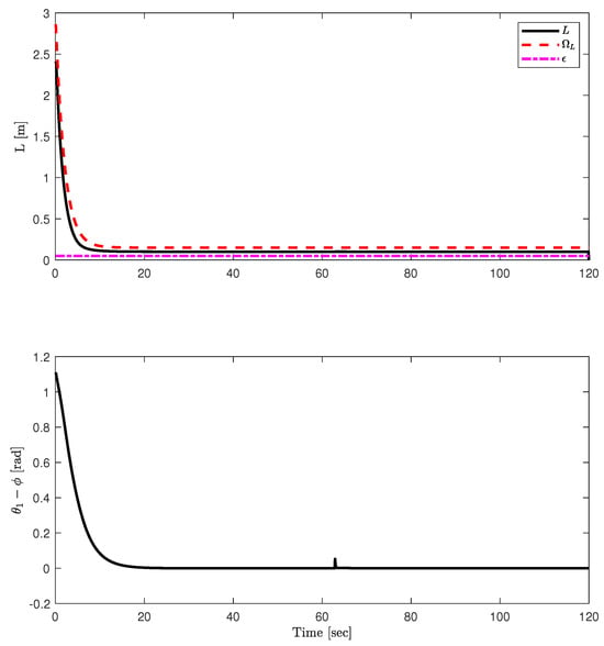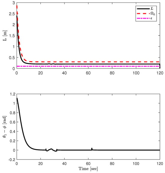 For the performance constraints, we established the upper bound as and the lower bound as . This configuration necessitates that the distance tracking error L be confined within an exponentially decreasing envelope to ensure accurate tracking, while also being maintained above a minimal positive value to circumvent singularities.