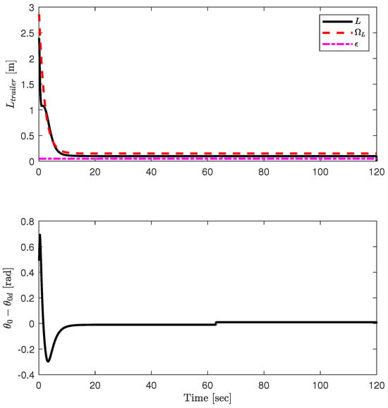 For the performance constraints, we specify the upper bound and the lower bound . This implies that the distance tracking error L is constrained by an exponentially decaying function to guarantee precise tracking, while adopting a small positive constant as a lower bound is employed as the lower bound to preclude issues related to singularity. The control gain K is determined to be . Initial conditions were prescribed for the tractor–trailer system as follows: , , , , , and .