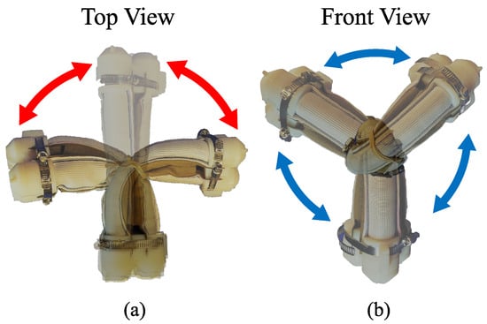 Demonstration of the omnidirectional bending of a horizontally mounted OBA: (a) Top view showing lateral bending, with left bending achieved through pressurization of one chamber to 414 kPa and right bending through pressurization of two chambers to 414 kPa. (b) Front view showing the OBA’s ability to perform bending motions across 360°, achieved by pressurizing each chamber to 414 kPa for all three configurations.
