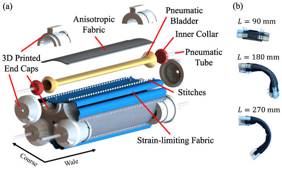 - Cappello, L.; Galloway, K.C.; Sanan, S.; Wagner, D.A.; Granberry, R.; Engelhardt, S.; Haufe, F.L.; Peisner, J.D.; Walsh, C.J. Exploiting Textile Mechanical Anisotropy for Fabric-Based Pneumatic Actuators. Soft Robot. 2018, 5, 662–674. [Google Scholar] [CrossRef] [PubMed]