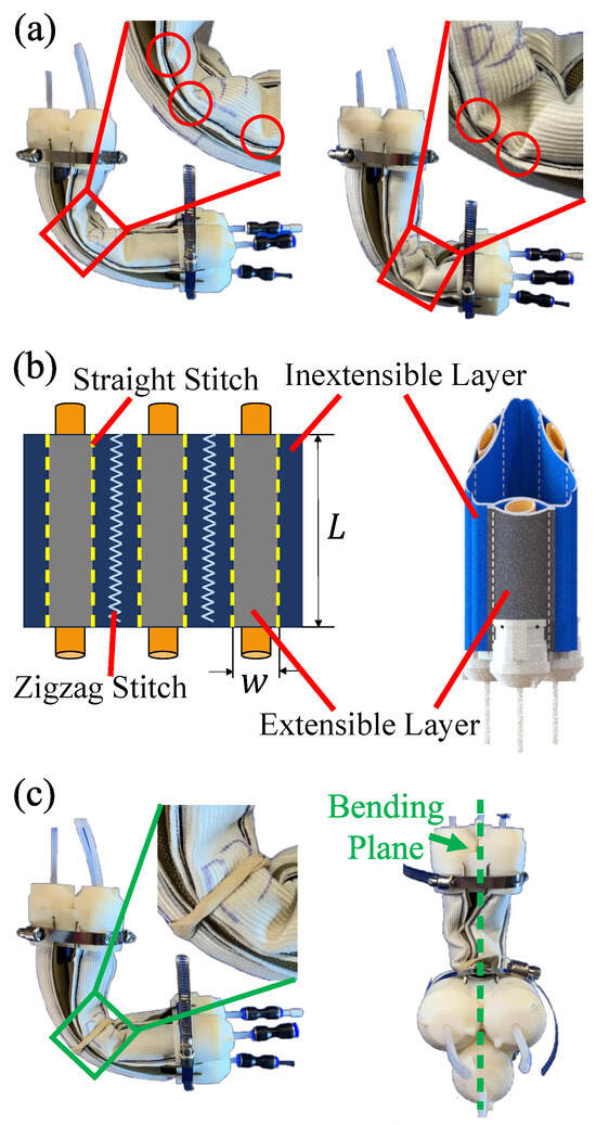 To address these spatial and temporal inconsistencies, we invented a novel fabrication method including the following two main steps: (1) we designed the inextensible layers to be wider than the extensible layer, allowing for the inextensible layers of the three chambers to be combined in parallel by stitching along their longitudinal edges, as shown in Figure 3b, and (2) we introduced a pre-buckling mechanism by securing a rubber band around the actuator’s midsection, affecting all chambers. The diameter of the rubber band should be smaller than that of the OBA to guarantee effective compression at the interface where the rubber band contacts the fabric chambers. This compression introduces pre-buckling before actuation and thereby ensures repeatable buckling at the same locations during cyclic actuation. These adjustments successfully standardized the buckling location across repeated actuation cycles, ensuring consistent, in-plane motion as shown in Figure 3c.