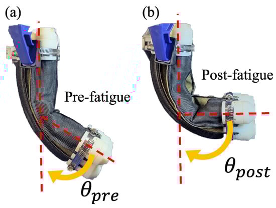 In addition, we investigated the impact of material fatigue on the performance of the OBA. The difference in stiffness of the OBA components between a newly fabricated actuator and those that underwent repeated actuation cycles caused an inconsistency in the motion range between the two OBAs. This phenomenon is attributed to the inherent material properties of the OBA’s soft components (e.g., pneumatic bladder and anisotropic fabric). Initially, these materials are relatively stiff, but as material fatigue sets in, they gradually soften and become more pliable, influencing the OBA’s performance. After enduring 60 fatigue cycles, the materials reach a state of equilibrium, leading to a more consistent bending angle of the OBA. Figure 4a,b show the bending shape of the pre- and post-fatigued OBA pressurized at 414 kPa, respectively. Initially, the OBA exhibited a bending angle of 54.2°. After enduring 60 fatigue cycles, there was a notable increase in the bending angle to 88.8°. Following 120 fatigue cycles, the bending angle stabilized, showing a slight increase to 90.8°. This progression indicates that the OBA can have a substantial and consistent range of motion after 60 fatigue cycles.