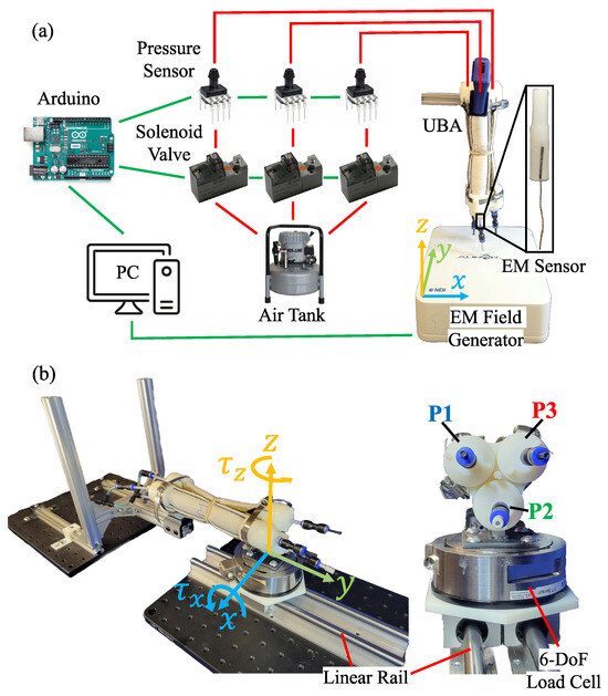 Experimental platforms for OBA characterization: (a) Load-free workspace measurement setup, including an EM field generator, an EM sensor attached at the free end of the actuator, and pneumatic control accessories (Red and green lines represent pneumatic and digital connections, respectively). (b) Experimental setup for force output measurement, utilizing a 6-DoF load cell and a linear rail to neutralize extension forces, with each chambers denoted as P1, P2, and P3 (Pneumatic connection is equivalent to those used for workspace measurement).