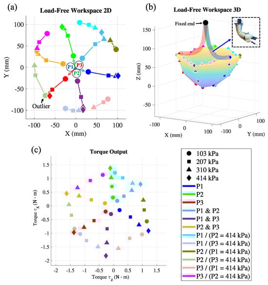 To ensure the reliability of our findings, each test for the same pressurization condition was repeated three times. Our measurements showed a maximum position difference (Euclidean distance) of ±0.70 mm and an average difference of ±0.34 mm for the three repeated tests among all workspace data. The high repeatability demonstrated the advantage of our design and fabrication method as explained in Section 2. Figure 6a shows the 2D visualization of the OBA’s tip position measurements in the x–y plane obtained by averaging results from three repeated tests. This figure is annotated with labels P1, P2, and P3, corresponding to the OBA’s individual chambers. Directional arrows are used to indicate the specific bending direction associated with each chamber. Colors denote the chamber combinations, while the shapes denote the pressure levels, as indicated in the legend in Figure 6c. This common legend applies to all subsequent characterization plots. The notation “/” signifies configurations where the pressure in the chamber listed to the left of the “/” symbol is adjusted, while the chamber on the right side of this symbol is maintained at a constant pressure of 414 kPa. It is evident that by manipulating different chamber pressures, the OBA can cover a significant area in the x–y plane with any points within the circular boundary being attainable. (P3 = 414 kPa, P2 = 103 kPa) is an outlier as it did not displace as significantly as the other symmetrically equivalent points. This may be due to the imperfect fabrication of the OBA, where the three chambers may not lay perfectly parallel with each other, as it could slightly shift its orientation during integration. Also, friction between the silicone tubing and fabric may not be perfectly equivalent across all chambers, which can cause inconsistent motions. Figure 6b further elaborates on the OBA’s omnidirectional bending capabilities in 3D space. Each data point represents the averaged x–y–z position of the OBA’s tip under specific chamber pressure configurations. The dome-like shaded surface represents the 3D workspace of the OBA’s tip. The analysis of the figure reveals that actuating a single chamber in the OBA results in larger bending angles compared to double chamber actuation at the same pressure. Specifically, the maximum bending angle achieved with single-chamber actuation was 90.80°, while for double chamber actuation, it was 79.19°. These bending angles were calculated as averages across all feasible chamber combinations for each actuation mode. The observed difference in bending performance between single and double chamber actuation can be attributed to the increased friction between the pneumatic bladder and the fabric sleeve when two chambers are activated simultaneously. This increase in friction likely arises from the intersecting and conflicting bending directions of the two chambers.
