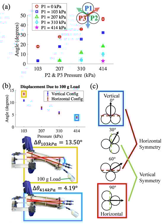Stiffness modulation of the OBA: (a) bending angle of the OBA under different combinations of chamber pressures. (b) (upper) angular displacement of the OBA due to a 100 g payload versus the pressure of the chambers, (middle) image of the deformed OBA at 103 kPa, and (lower) image of the deformed OBA at 414 kPa. (c) cross-sectional symmetry of the OBA: 0° and 60° exhibit horizontal symmetry while 30° and 90° exhibit vertical symmetry.