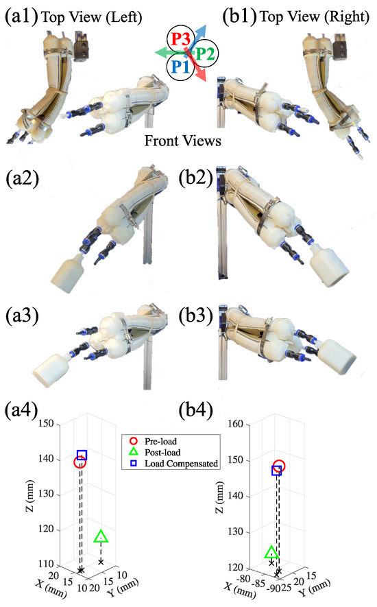 Due to the OBA’s omnidirectional bending capability, the OBA can mitigate unwanted out-of-plane deformations induced by payloads. This feature distinguishes the OBA from traditional bidirectional in-plane bending soft actuators, which typically can adjust for deformations along its bending plane but struggle to address deformations that extend beyond this plane. To demonstrate this ability, the OBA was mounted horizontally on one end in the horizontal cross-sectional orientation. An EM sensor was used to measure the position of the OBA’s free end. Each test was repeated three times. Figure 8(a1,b1) show the OBA’s bidirectional bending motion (left and right, respectively) from the top and front perspectives after pressurization and before any payload was applied. The applied pressures and position measurements for these states are listed in Table 1 under “Left/Pre-load” and “Right/Pre-load.” This configuration serves as the reference state to which subsequent deformations and compensations are compared.