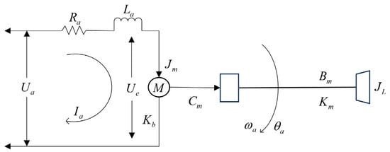 where denotes the armature voltage and represents the armature current. and are the equivalent resistance and inductance in the motor drive circuit, respectively. is the motor torque coefficient, the load friction coefficient, the spring stiffness coefficient, the load inertia moment, and the rotational inertia of the motor. J is the sum of and , representing the equivalent inertia on the motor shaft. stands for external disturbances, is the back electromotive force generated by the coefficient , and , respectively, signify the system deflection angular velocity and angular displacement, and is the system angular displacement output, including the deflection and measurement noise n.