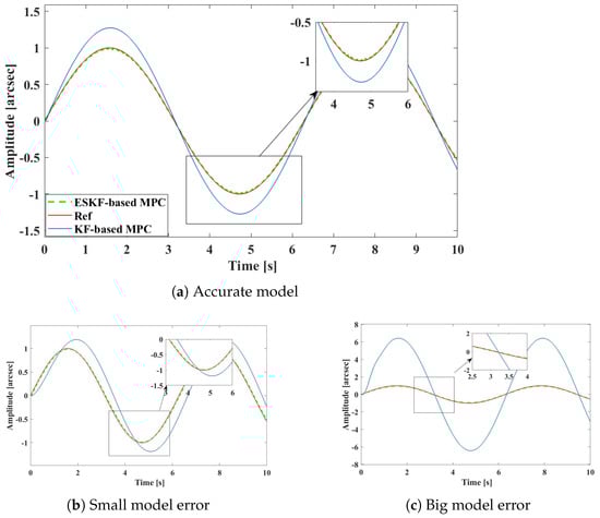 In the simulations, the tolerance to model errors and the disturbance suppression ability of the ESKF-based MPC were evaluated. Initially, in the absence of external disturbances, the model parameters of the controlled object state-transfer matric A in the closed-loop system were altered, as illustrated in Table 1. Under varying model conditions, the MPC method based on Kalman filters (KF-based MPC) exhibited increased amplitude and phase lagas, as shown in Figure 3. In contrast, the ESKF-based MPC method demonstrated superior tracking performance even when the model changed.