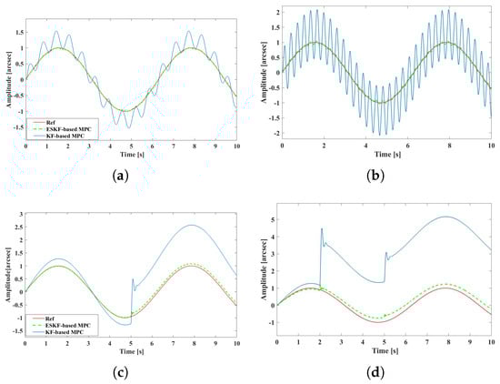 Closed-loop response of ISP subject to KF-based MPC and ESKF-based MPC for sinusoidal reference. (a) Sinusoidal disturbance (amplitude = , frequency = ). (b) Sinusoidal disturbance (amplitude = , frequency = ). (c) Step disturbance amplitude = 1, step time = 5. (d) Multiple step disturbances amplitude = 1, step time = 5 s and amplitude = 2, step time = 2 s.