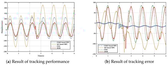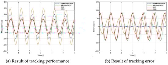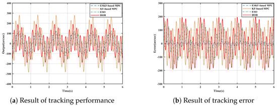 The experiment E2 results are shown in Figure 7, demonstrate that the proposed method effectively and accurately tracks the given sinusoidal signal compared to the KF-based MPC. It is evident that the maximum tracking error for the KF-based MPC reached 83.5 arcsec, whereas the proposed method achieved a maximum tracking error of 16.2 arcsec, representing a decrease of 80.5%. The maximum tracking error for the ESO reached 84.6 arcsec, representing a decrease of 80.9%. And the maximum tracking error for the DOB reached 76.8 arcsec, representing ESKF-based MPC realized a decrease of 78.9%.