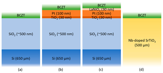 At the thin-film level, it is generally desirable for piezoelectrics to have large, well-coalesced, and well-oriented grains with few grain boundaries, as this enhances the ferroelectric and dielectric responses [12,22]. The substrate as well as the choice of the seed-layer material influence grain size, orientation, and film texture. Platinized silicon is perhaps the most industrially relevant platform for thin-film piezoMEMS development today. A thin layer of (001)-oriented LaNiO3 (LNO) is commonly added as a seed oxide electrode to promote (001)-orientation and the piezoelectric properties of ferroelectric perovskite oxides, to act as a chemical diffusion barrier, and to prevent fatigue [16,17,23]. However, if the substrate is much thicker than the film, the mechanical properties and stress state of the piezoelectric layer stack system are substrate-dominated. Si and SiO2 have relatively low CTEs, ~3.6 µm/K, and ~0.65 µm/K, respectively [24], whereas for BaTiO3-derived compositions, the CTE is comparatively high. BCZT-based compositions have reported values of 11 < < 17 µm/K, and required crystallization temperatures of up to 800 °C [25,26]. In comparison, PZT has a CTE of ~4.5 µm/K, and is typically deposited around 650 °C [2,20,27]. Thus, better CTE-matched substrates, such as (001)-oriented SrTiO3 (STO) with ~9.4 µm/K [15], or MgO with ~13.5 µm/K [28], are often used experimentally. STO with an in-plane lattice constant about 2% smaller than BCZT ( Å vs. has also been shown to promote epitaxial film growth with compressive strain and favored c-axis orientation. Furthermore, making STO electrically conducting by Nb-doping to function as a bottom electrode with high temperature stability is attractive for thin film integration. For this reason, STO has become one of the more studied templates for BCZT thin films [16,19]. These substrates are, however, not industrially viable. Thus, direct integration of BCZT thin films with Si is still being actively pursued in the literature, but stress measurements of BCZT thin films, which are important to understand the mechanical and piezoelectric properties, are scarce.