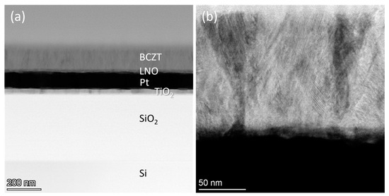 TEM images of a cross-section of BCZT/LNO/Pt/Si stack with BCZT deposited at 700 °C: (a) bright-field TEM image with layers indicated, and (b) larger magnification bright-field TEM image of the BCZT film (gray).