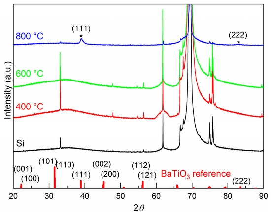 X-ray diffractograms of the Si substrate and ~100 nm BCZT thin films deposited at 400 °C, 600 °C, and 800 °C onto Si. Asterisks indicate BCZT reflections. The sticks at the bottom refer to tetragonal BaTiO3 (COD 2100858).