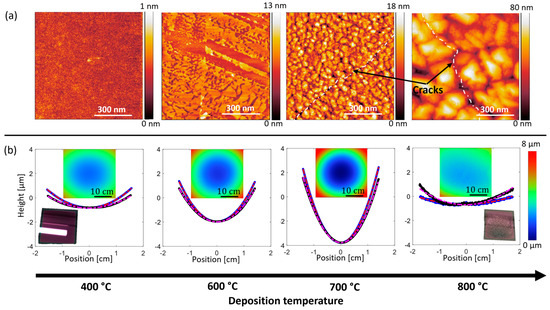 Figure 4b shows the curvature evolution for a series of BCZT films with nm deposited on Pt substrates at °C. The inset pictograms show the substrate at TD = 400 °C and TD = 800 °C. Before deposition, the investigated substrates had initial curvatures of m, m, and m. At TD = 200 °C, the radius of curvature of the film–substrate system after deposition (r) was larger than the radius of curvature before deposition (), and thereby was true for all substrates, indicating the films were under compressive stress. For all films deposited on Si-based substrates at TD ≥ 400 °C, the radius of curvature was smaller after deposition (in the range of 15–100 m, Table S1), giving , indicating tensile-stressed films. Although heavily cracked at 800 °C, resulting in stress alleviation and substrate-flattening, areas with adherent film allowed for AFM images to be taken. It is, however, noted that all films of nm deposited at TD ≥ 700 °C on Si-based substrates displayed large cracks and were disregarded for further analysis. In comparison, the deposition of BCZT onto STO at 700 °C gave compressively stressed films of around 2 GPa (see Table S1). This is rationalized from the larger unit cell of BCZT compared to STO.