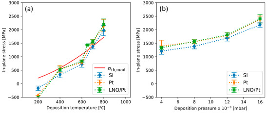 (a) Measured in-plane stress as a function of deposition temperature, TD, with constant deposition pressure of =8 × 10−3 mbar; predicted in-plane stress using the laminate theory model is shown by the solid red line. (b) Measured in-plane stress as a function of pD at TD = 700 °C.