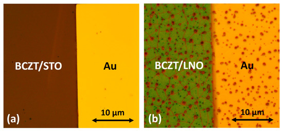 Optical microscope images showing the electrode edge and films on 200 nm thick BCZT films deposited at 700 °C on (a) STO and (b) LNO/Pt-coated Si.