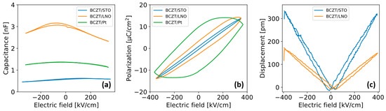 Capacitance field (a), polarization field (b), and piezoelectric force microscopy (PFM) (c) measurements of BCZT films with nm grown at 700 °C on the three substrates: STO (blue), LNO/Pt (orange), and Pt (green). Piezoelectric responses could only be detected for BCZT on STO and BCZT on LNO/Pt due to the high defect density for thicker films grown on Pt.