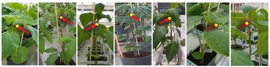 Experts’ selections of clipping points on cucumber, tomato, and pepper seedlings. The yellow circle with the red arrow show the suggested clipping points from expert farmers.