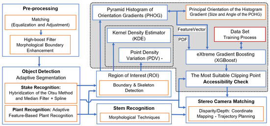 The recognition of a suitable clipping point using the combination of a kernel density estimator (KDE) and pyramid histogram of oriented gradients (PHOG) is a promising approach in computer vision and image processing. The KDE is a non-parametric way to estimate the probability density function of a random variable, while PHOG is a feature descriptor that captures the local shape information in an image. Figure 3 shows the schematic of our proposed method using images taken with a stereo camera. In the pre-processing step, after camera calibration using Zhang’s method [20], the global contrast of the image is enhanced using the histogram equalization. To normalize all images for different lighting conditions, the cumulative distribution function matching method is used to balance the target images with a reference image by removing systematic differences or re-scaling the histogram of images taken in different lighting conditions [21]. High-boost filters and morphological boundary enhancement [22] are used to enhance and restore images before the object detection module. In the next step, the plant, stem, and stake are detected. We then use the boundary and skeleton of the segmented plant to find the region of interest (ROI), limit the searching area, avoid unwanted points, and accelerate the process.