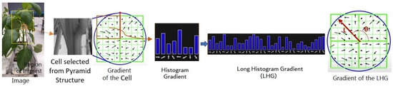 The pyramid histogram of oriented gradients (PHOG) is a feature descriptor used in computer vision for image analysis and object recognition [35]. It was introduced as an extension of histogram of oriented gradients (HOG) to capture both local and global information about the shape and structure of objects in an image. HOG represents a signature of the features of spatial regions [36] and is particularly useful when dealing with images that contain objects at different scales. PHOG divides an image into small cells and computes HOG within each cell. These histograms provide a representation of the local texture and edge information. PHOG extends HOG by incorporating a pyramid structure. Instead of analyzing the entire image at a single scale, PHOG divides the image into multiple scales or levels. This helps in capturing information at different resolutions, allowing the descriptor to be more robust to variations in object size and scale. At each level of the pyramid, HOG features are computed for local image regions (cells). The features are then concatenated to form a representation for that level. Additionally, these level-specific representations are combined across the pyramid to capture global information. For computing the HOG of each cell, we used the first quarter of the cell to compute the histogram gradient in sixteen directions. We considered all different directions and the number of pixels within each direction. These steps were repeated for other quarters. The resulting orientation histograms were concatenated to create a long histogram gradient (LHG). Figure 4 shows the main steps of computing the HOG.