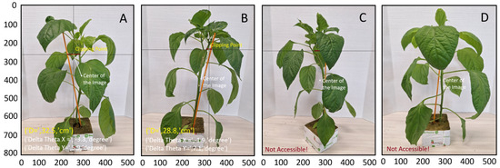 where and are the mean values of the skeleton in the x and y directions, respectively, for all non-null pixels; , , and are, respectively, the right, left, and top values of the seedling boundaries for non-null values; and are the values of the skeleton in pixel ; and , , and are the number of null values for the right, left, and top of the boundary of the plant, respectively.