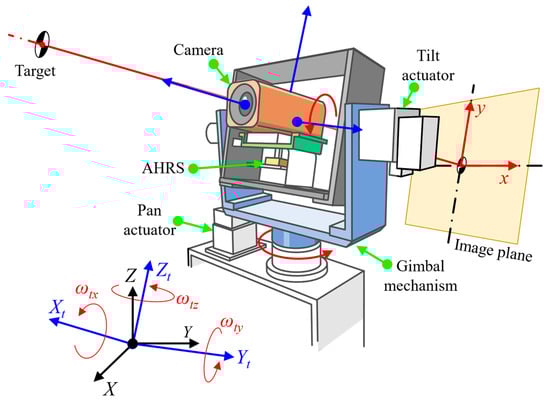 The structure of the gyro-stabilized system to be controlled is shown in Figure 1. A completed representation of the system, with the dynamics of a two-axis gimbal and kinematics of a projection on the image plane, is as follows [27]: