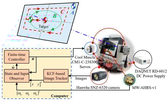 The experiments were conducted in order to validate the proposed control system. For this objective, Figure 2 depicts the experimental apparatus that was used with the proposed control scheme and experiment scenarios. In detail, the experimental system consists of a two-channel gimbal prototype that carries the Hanwha SNZ-6320 camera on its inner channel. Given a captured image from the camera that contains the tracked object, an image tracker uses the KCF algorithm [34] working with the histogram of oriented gradients (HOG) descriptor and the Gaussian kernel and returns the location of the object’s projection on this image. The rotational motions of two channels are operated by two servo systems CM1-C-23S30C from Muscle Corporation. The inner channel is directly driven by the servo, while the outer one adopts a belt drive with a gear ratio of 3:1. The orientation of the camera and the inner gimbal is sensed by an attitude heading reference system, MW-AHRS v1. Additionally, the image tracker, observer, and controller were executed by Matlab/Simulink on a desktop computer and interacted with the experimental apparatus. The gains of those are listed in Table 1.