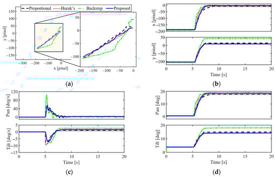 For quantitative evaluation, the root-mean-square errors (RMSEs) of the projection were computed and are listed in Table 2. The results of Experiment A imply that the proposed system is only the second best. However, the time responses from Figure 3b indicate that these large values of RMSE are due to the longer rise time, especially in the x-coordinate, though the settling times are almost the same. The reason is found to be due to the lower peak velocities of the gimbal during the transient period in the proposed system, which is better from the perspective of the image-tracking algorithm. Similarly, in Experiments B and C, the proposed system achieves a significantly better RMSE in the y-coordinate, but only the third best in the other coordinate because of the large transient period of this coordination. If the transient period at the beginning of Experiment B is neglected, i.e., the zoom in Figure 4b, the RMSE of the proposed system in the x-coordinate is 0.1107 [pixel], just less than 0.0934 [pixel] of the backstepping control system. In Experiment C, apart from the transient period, the proposed system achieves the smallest steady-state error. Generally, the proposed controller shows its consistency and ought to perform better than the others. On another note, the proposed control law is quite complicated in comparison to the comparative controls, though it does not need more measurements than the others. The results of the three experiments also reveal that the proposed system requires more control adjustments, and so do the control efforts, especially in comparison to the proportional control and the control proposed by Hurak. Finally, although the proposed system achieves the smallest steady-state errors in most cases, finite-time boundedness is preserved but not the asymptotic stability.