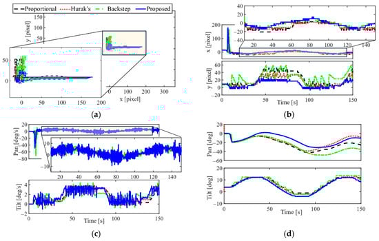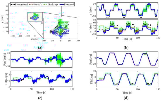 In this experiment, the target projection was at location [pixel] in the image plane in the beginning. From the 5th [s], the target moved continuously on an ellipse line in a vertical plane facing the camera from a distance of 600 [mm]. The horizontal and vertical motions of the target were given by sinusoidal trajectories with a 0.01 [Hz] frequency and 410 [mm] and 210 [mm] amplitudes, respectively. The tracking paths in Figure 4a show that all the controllers quickly brought the target’s projection to the center of the image plane and then kept it there, even with the motion of the target. However, a large variation around the image center in Figure 4a demonstrated that the comparison controllers could not track the moving target effectively. In particular, in the x-coordinate, the proportional control system and Hurak’s system result in the largest variation. In the y-coordinate, the proportional control and the backstepping control systems have the largest tracking errors, then the control system designed by Hurak et al. In contrast, the proposed control system guarantees the boundedness of the control errors in finite time, hence resulting in a small variation in the projection’s location in both coordinates during the test, which can easily be seen in Figure 4a,b. The control inputs in Figure 4c show the adjustment that the proposed controller made. Since the target followed an ellipse line, the tilt and pan rotations of the inner gimbal also followed sinusoidal trajectories, as seen in Figure 4d, so that the LOS of the carried camera could track the desired target.