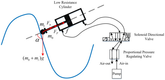 This section will introduce the compliant grinding device’s working principle and main control objects. The practical application scenario of compliant grinding is shown in Figure 1. Figure 2 shows the compliant grinding device’s physical diagram. The compliant grinding device consists of a proportional pressure-regulating valve, an electromagnetic directional valve, a low-friction cylinder, a single-axis angle sensor, and a magnetic induction displacement sensor. The proportional pressure-regulating valve has the functions of both air pressure regulation and air pressure measurement. Therefore, by connecting the pressure-regulating valve to the front of the cylinder, the current air pressure value of the cylinder can be detected in real time. This article models the load end, cylinder, and proportional pressure-regulating valve separately, unlike the traditional overall control system modelling method.