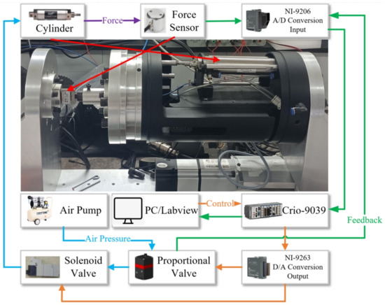 Figure 5 displays the test bench that we constructed. The compliance grinding device is fixed on a linear guiding rail. The experimental system uses a PC as the upper computer, and the control algorithms are exerted in the environment of NI LabVIEW. NI cRIO-9039 is used as a high-speed real-time lower computer, which receives instructions issued by the upper computer and sends the calculated system instructions to the lower computer in real-time. The lower computer ultimately generates the specified voltage and acts on the proportional pressure-regulating valve through the NI 9263 module to regulate the input air pressure into the cylinder. At the same time, the state value of the air pressure measured by the pressure-regulating valve in the cylinder is also fed back to the lower computer through the data acquisition module NI 9215,and the lower computer sends the feedback signal back to the upper computer.