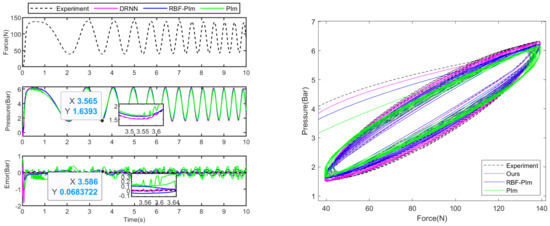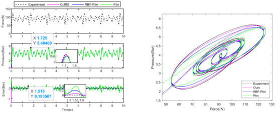 The experimental results that correspond to this are shown in Figure 6 and Figure 7. The results displayed in Figure 6 indicate that our hysteresis compensation model is more effective than two other models compensating for the force–pressure hysteresis of the cylinder with continuous variations of 2–5 Hz frequency under Case 1. Specifically, our model outperformed the rate-dependent RBF-PIm hysteresis model and traditional PIm operator hysteresis model. As shown in Table 1, the error of our proposed model measured is bar, which is smaller than bar for the RBF-PIm model and bar for the PIm model.