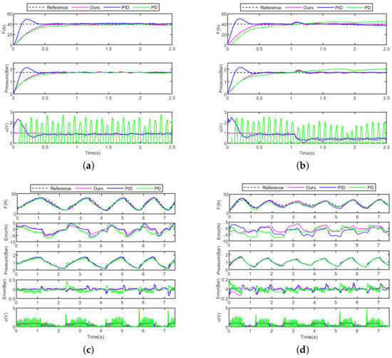Force and pressure tracking of different controllers (Experiment 2). (a) Case 1. (b) Case 2. (c) Case 3. (d) Case 4.
