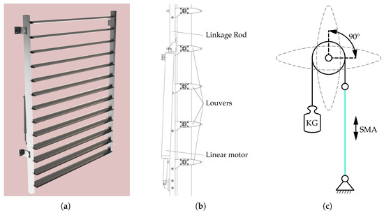A standard sunshade system was utilized in this development. The angular position of all louvers was coupled through a linkage rod. (a) depicts a 3D model of the sunshade construction system. (b) presents a sectional drawing with the labeling of various components. The illustration in (c) schematically demonstrates the intended application of the SMA.