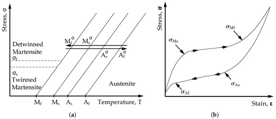 Under a mechanical load detwinned martensite can be induced from the twinned martensitic state [8,9]. This process involves reorienting a certain number of variants in the favorable direction. Detwinning leads also to a noticeable change in the material’s shape, which is almost retained even after the load is removed. However, the applied load must reach a certain threshold to initiate the detwinning process, known as the detwinning start stress . If the load achieves a sufficiently high level, complete tdetwinning of the martensite occurs. This stress level is referred to as the detwinning finish stress . Figure 2a illustrates the various points and the material behavior schematically.