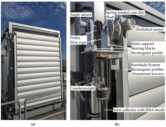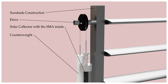 The developed actuator assembly consisted of several components: sunshade construction, drive, counterweight, SMA-wire, and solar collector (cf. Figure 3). The sunshade construction was modified, with the linear motor being removed. The axis of the top louver was connected to an approximately 30 mm thick shaft, which penetrated the two sheets of the outer aluminum support profile and extended approximately 10 to 20 cm. All louvers were still flexibly joined to the linkage rod, and by rotating the top shaft by 90°, the entire sunshade construction was closed. The linkage rod was eccentrically positioned and, due to its weight, ensured the opening of the sunshade construction when the louvers were horizontally arrangedin absence of external forces.