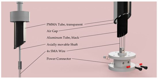 The SMA-wire was enclosed within a thermal solar collector for the thermal activation [10]. Therewith, temperatures significantly higher than the outdoor ones could be achieved when the collector was directly exposed to solar radiation. Hence, the activation temperatures of the SMA wire could be purposefully achieved. The selected heat transfer medium inside the solar collector was air. The heating of air within the solar collector is based on the greenhouse effect. It is similar to the process of a room being heated in summer by solar radiation passing through glass surfaces. The collector was thus used as a temperature-controlling element triggered by solar radiation. The solar collector consisted of a transparent PMMA tube and a concentrically located black-painted aluminum tube. The two tubes were connected via a shaft seal at each end, which hermetically sealed the air gap between them. The aluminum tube contained the SMA wire and was hermetically sealed on both ends by special cover points. Figure 4 depicts the cover points in a 3D model of a solar collector. The upper cover point included an axially movable shaft for transmitting the displacement of the SMA wire to the actuator. The shaft was equipped with two shaft seals. At the lower connection point, the wire ends were permanently clamped using screws, and connections were provided for electrical contact.