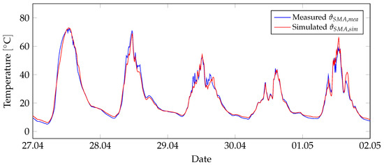 The model validation was realized through the comparison of simulated results with experimental data from real-world trials. Various scenarios and boundary conditions were considered over a continuous period of 14 days to ensure an accurate model. The experimental setup included the developed collector with a length of 1 m. It was located on the roof of a three-story building in Leipzig, Germany, oriented to the south and not shaded by surrounding structures. The top and bottom openings were sealed against air and water. A temperature sensor was installed in the center of the inner air chamber of the collector. We assumed that the air temperature in the center of the solar collector corresponded to the temperature of the SMA wire. This assumption was based on the fact that the sensor and sensor wiring were made of a metallic wire similar to the SMA-wire, and their properties were expected to be comparable. Furthermore, the recording of boundary conditions includes outdoor air temperature and south-facing solar radiation. With a measurement output at 10-min intervals, data from April to May 2020 over a period of 14 days were available. The measured boundary conditions were also implemented as boundary conditions in the model. For the simulation period, the temperatures of the SMA wire in the center of the collector were calculated and compared with the available measurement data. The measured and simulated data showed a high degree of agreement. The simulations were run with hourly mean values. In contrast, the measurement data were entered as 10-min mean values. This could be one reason why the simulated data showed a more stable curve. Figure 6 illustrates an exemplary comparison plot.