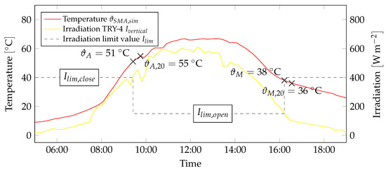 The validated simulation model was used to calculate SMA temperatures using climate data sets. Based on the vertical irradiation of the façade surface, the SMA temperatures at which the sunshade construction system should close or open were calculated. The diagram shows the evaluation of these variables for a single day.