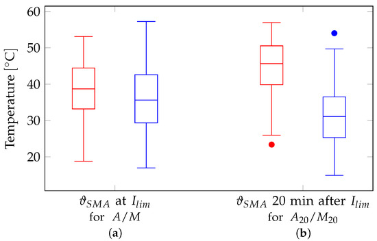 Evaluation of the calculated SMA temperatures as boxplot. Data are shown for temperatures at which the sunshade construction system should close (red) and reopen (blue). Two variants are compared: (a) the SMA wire temperatures at the time when the irradiation limit values are reached and (b) with a delay of 20 min after the values are reached.