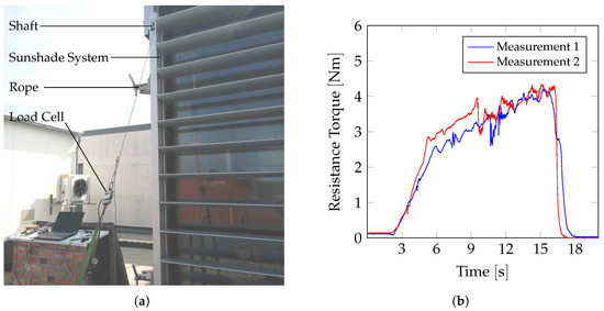 Measurements to determine the resistance force for the closing of the sunshade construction system. In (a), the experimental setup with the connection of the load cell is presented. (b) shows exemplary measurement data for the required torque to shift the louvers through the shaft by .