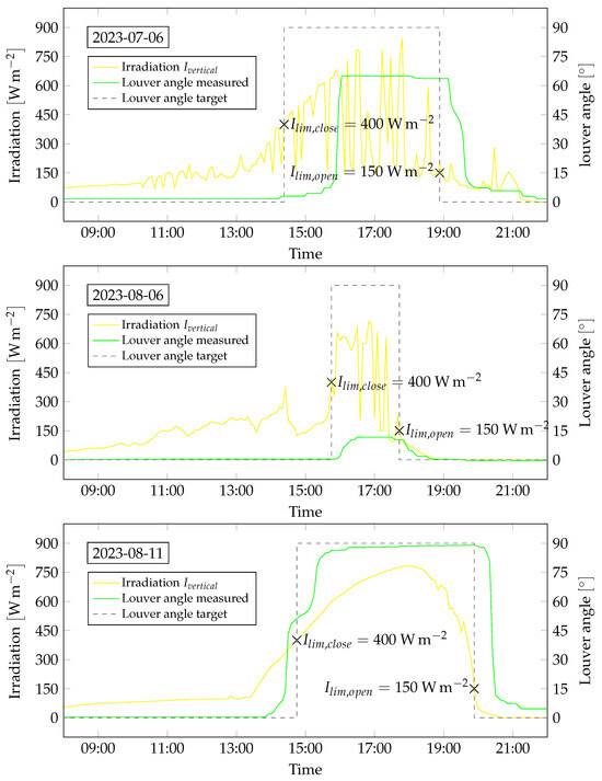 Measurement data of the full-scale demonstrator with the irradiation and the louver angle (measured and calculated from the irradiation threshold values). Data are shown over the course of three exemplary days (6 July 2023, 6 August 2023, and 11 August 2023).